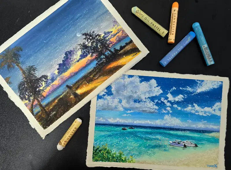 내가 본 풍경과 비슷했으면 좋겠으면서도 기억속의 느낌이 담겼으면 좋겠다는 생각으로 그렸는데, 카디페이퍼에 오일파스텔 조합이 그 느낌을 잘 이끌어낸거 같아서 기분이 좋아졌다ㅎㅎㅎ