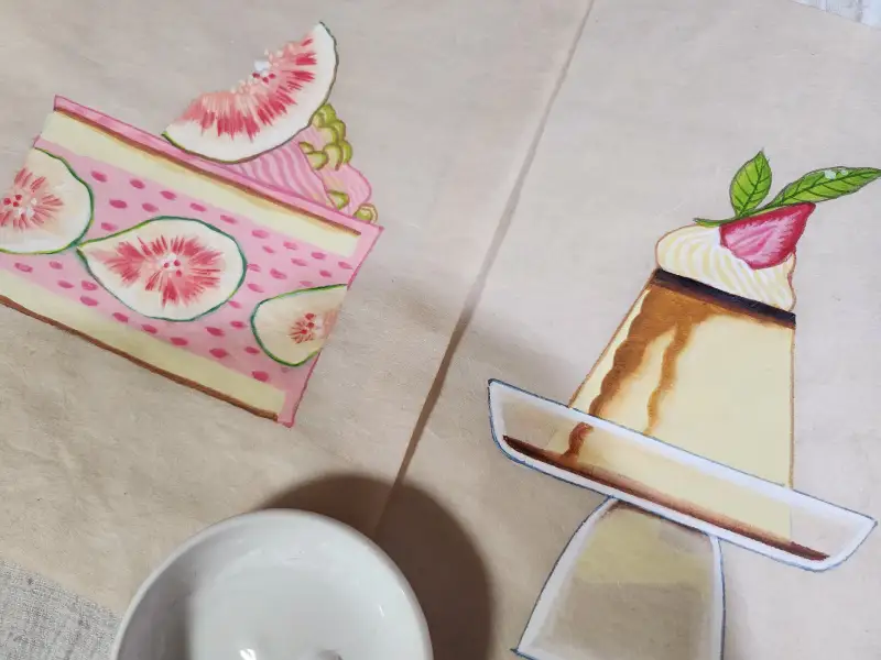 무화과와 케이크의 단면이 단청무늬 느낌과 비슷하다는 생각을 하며 나중에는 좀 의도하여 그렸어요.