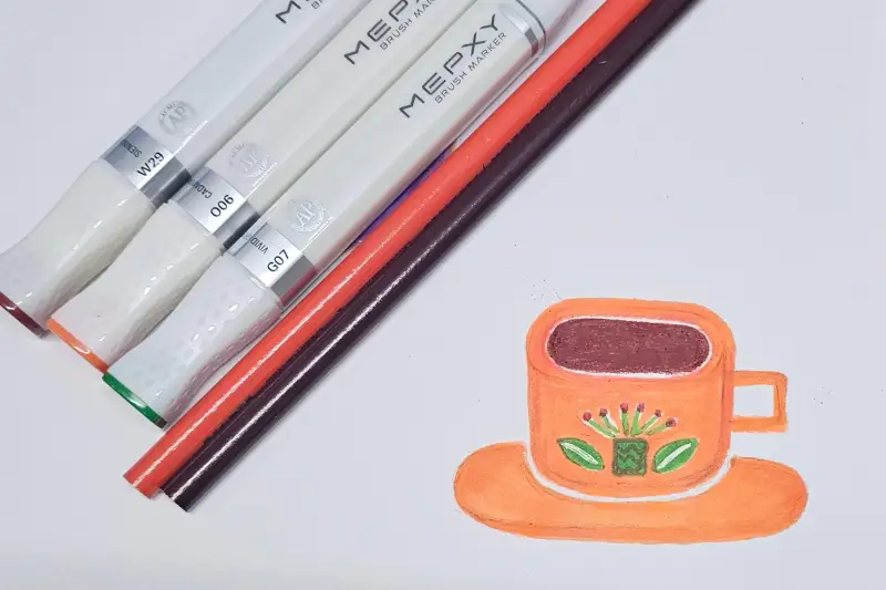 클래스101 바이냉 작가님의 "커피를 가득 담고 좋아하는 꽂 그리기" 를 알파브러쉬 마카랑 색연필로 그렸어요