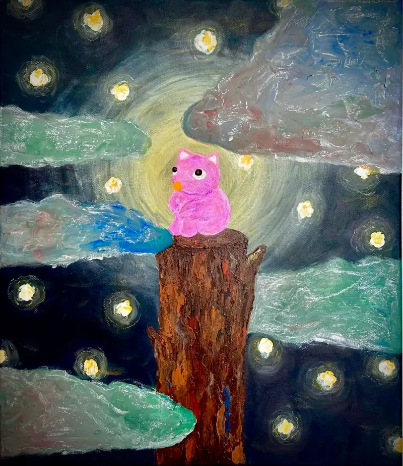 저는 이번에 첫 자취를 시작했는데요. 힘들었던 과거를 뒤로 하고 높은 나무 위에 올라 평온한 하늘을 바라보며 반짝이고 달큰한 향을 내는 별을 보는 저를 그림속에 담았습니다.