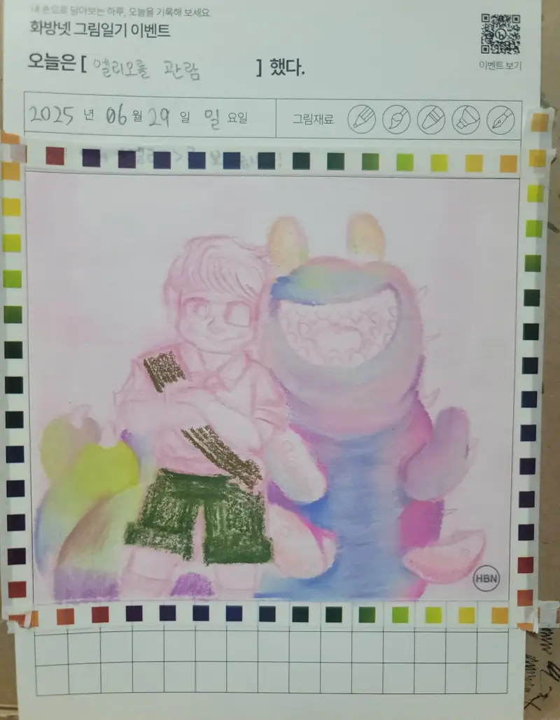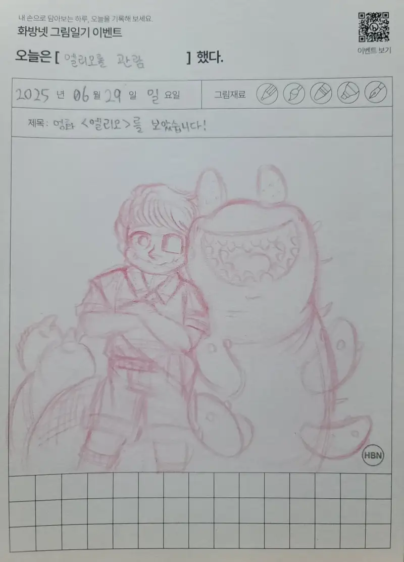 프리즈마 애니메이션 색연필로 빈 그림일기 용지에 스케치를 한 것 입니다. 극장 관람 시간이 초저녁이어서 미리 그림을 그려둬야 마감 시간에 늦지않게 완성할 수 있을 것 같아 그림만 먼저 그려두었습니다.
