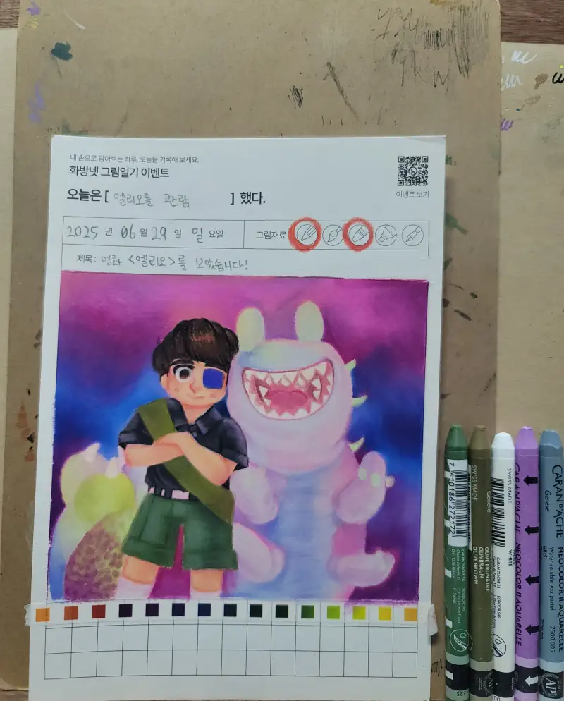 본 작품의 색감과 작화가 주는 느낌을 잘 살려주고자 프리즈마 72색 유성 색연필로 세밀한 묘사나 채색을 하고, 전반적으로는 까렌다쉬 네오칼라2 수성크레용으로 채색 했습니다.