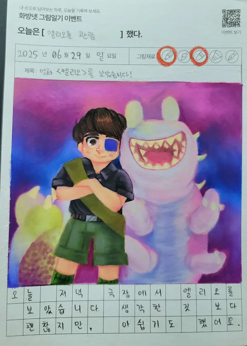 안녕하세요 marvelucat 입니다. 6월 29일 저녁에 영화 <엘리오>를 관람했습니다. 원래 저는 엘리오를 비롯한 외계인 캐릭터들의 디자인이나 스토리가 저의 관심을 크게 끌어주지 못해 이 영화를 볼 예정이 없었는데, 메가상자 극장 회원에게 주어지는 할인 티켓과 이동진 평론가 분이 이 영화를 리뷰하신 영상을 보고 직접 보고 판단하는 것이 좋을 것 같아서 영화를 극장에서 보기로 했습니다. 오늘은 특히 낮이나 밤이나 매우 더웠기 때문에 극장까지 걸어가면 생명의 위협을 느낄지도 모른다는 생각도 들어서 버스를 타고 극장에 가서 관람했네요. 여전히 너무 더운 하루입니다.🥵