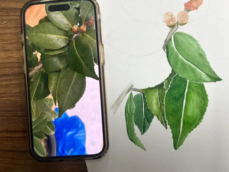 수채화 물감으로 밝은 잎맥과 경계의 빛 부분은 비워두며 색을 채워나갔어요.