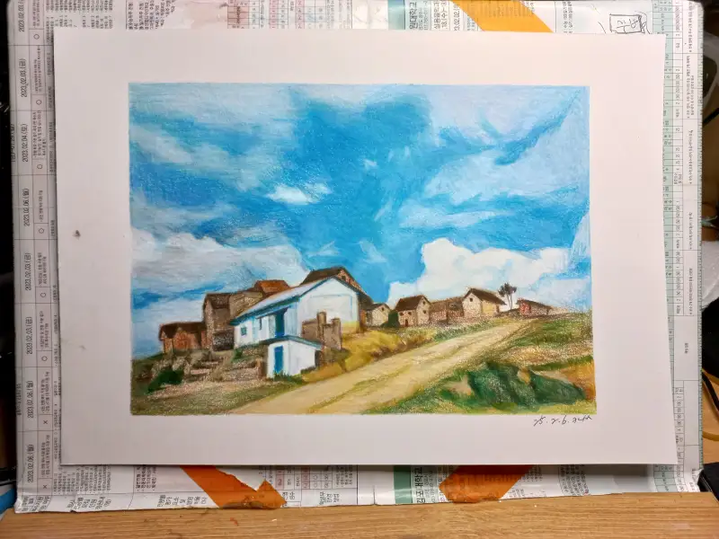 뭔가 쨍한... 그런 하늘과 낮은 지붕의 집들...