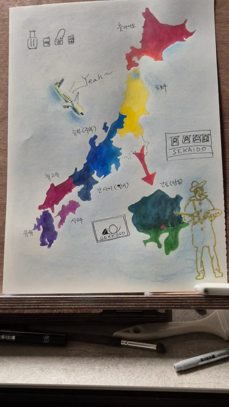 조만간 일본 도쿄로 화방 탐방 여행을 떠납니다. 버킷리스트라고 하면 뜬구름 잡는 거라고만 생각했는데 행동으로 옮길 수 있어서 설레기도 하고 긴장도 되고 뭐 그렇습니다. 배경 칠할 때 소프트파스텔 처음 사용해 봤는데 가루 엄청나게 떨어지던데요. 버리는 게 더 많은 듯. 아까비~ 떨어진 가루 붓에 묻혀서 슥슥~ 크기도 쬐매난 것이. 갑자기 개그우먼 김효진이 생각나네요. 갑자기 이 얼토당토 않은 전개는 무엇~? 일본 전도를 그리다 보니까 말이죠~ 훗카이도는 박쥐형상 같다고 느껴졌습니다. 자~ 그림에서 우리나라도 숨어 있더라고요~ 착한 분 눈에만 보입니다. 이탈리아도 숨어 있습니다~