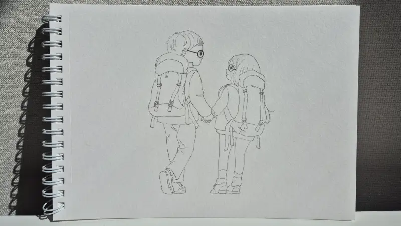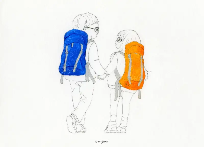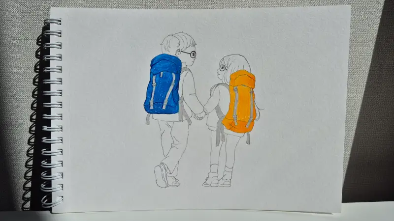 펜으로 그리고 배낭은 색연필로 칠했어요