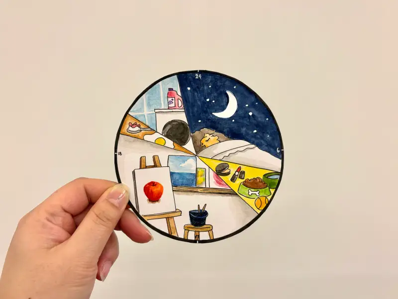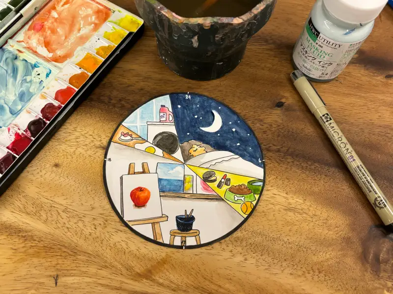 어릴적 방학숙제로 그렸던 계획표 느낌으로 하루시계를 그려보니 재밌는 작업이었던거 같아요.