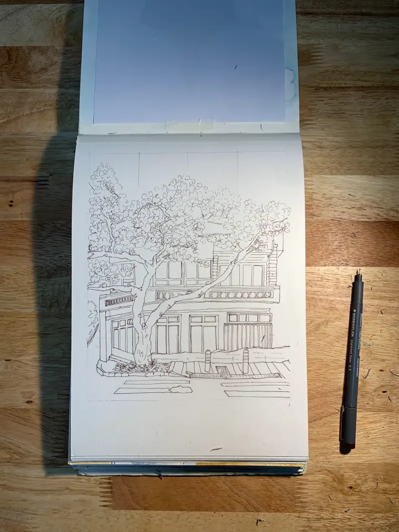 그다음으로 라이너 펜으로 그렸어요. 파스텔톤 느낌을 주고 싶어서 검은색 라이너펜가 아닌 갈색 라이너 펜을 사용했어요. 0.3밖에 없어서 조금 아쉬웠지만 갈색 라이너 펜으로 스케치 하니 또 다른 느낌이 들어요. 라이너 펜 굵기가 하나밖에 없어 해칭은 하지 않고 채색으로 음영을 표현했어요.