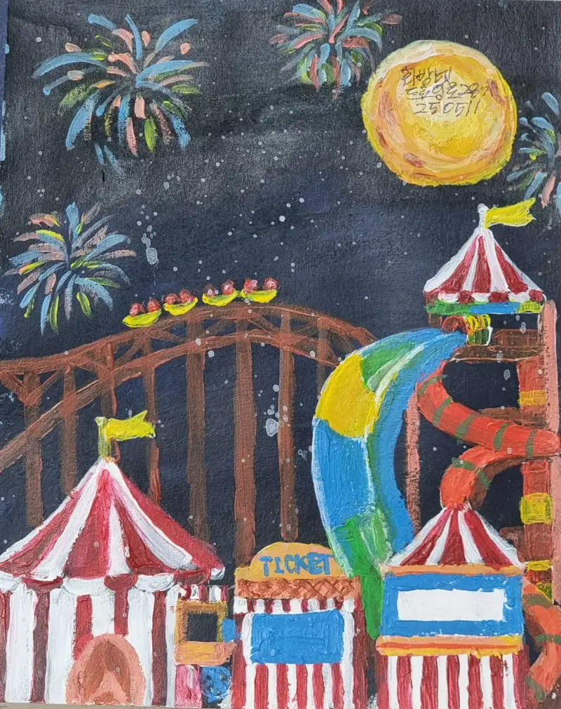 놀이기구와 어둠의 뚫고 퍼지는 폭죽이 주변을 화려하게 수 놓으며 기분을 업시켜 신나게한다