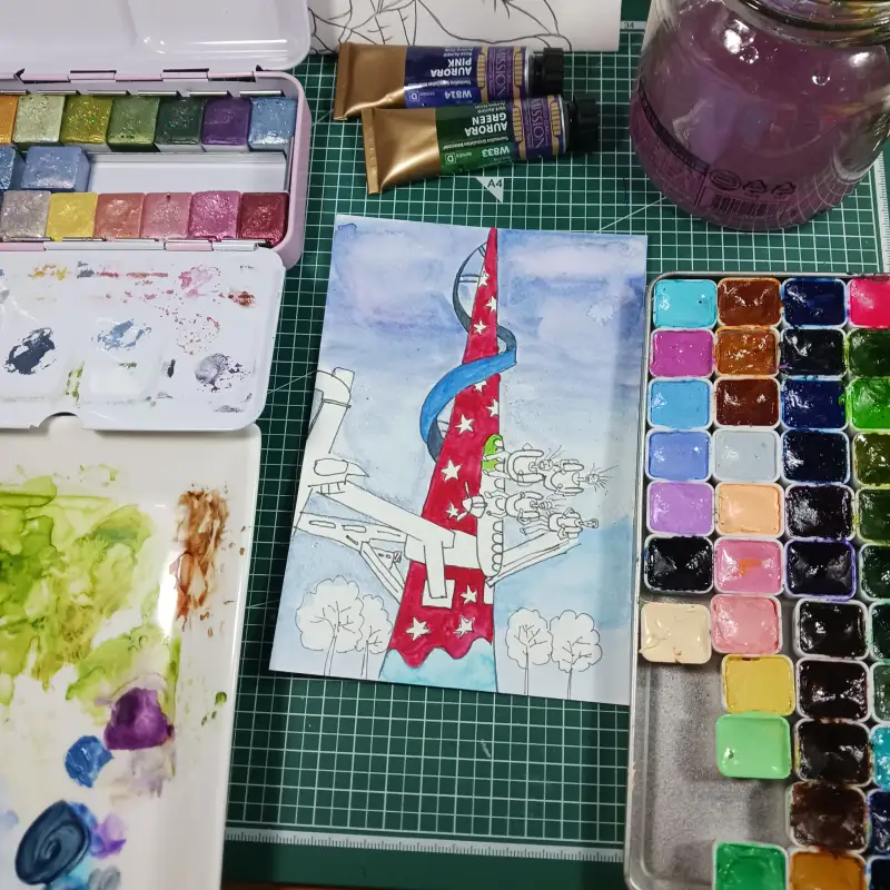 미젤로 미션 투르마린 투톤 그래뉼레이션과 수이과슈 펄 물감과 블루 수채물감을 섞어서 하늘에 신나는 기구타는 느낌을 펄로 표현했어요