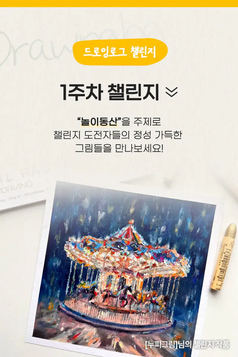 펄 오일파스텔이 더해져 더욱 화려한 회전목마가 되었네요! 너무 예쁜 야간 회전목마 그림이에요💜
