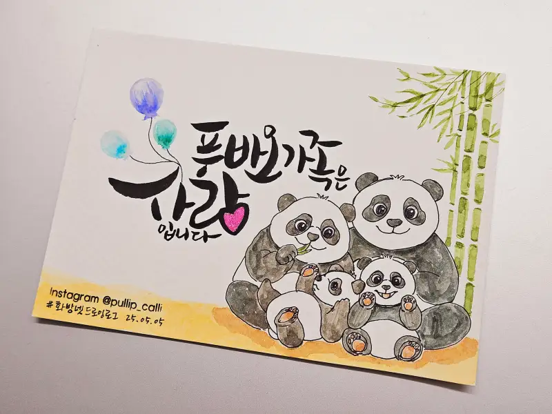 그리운 푸바오 가족을 캘리그라피와 함께 귀엽게 그려주셨네요~! 초롱초롱 눈망울이 너무 귀여워요!🐼