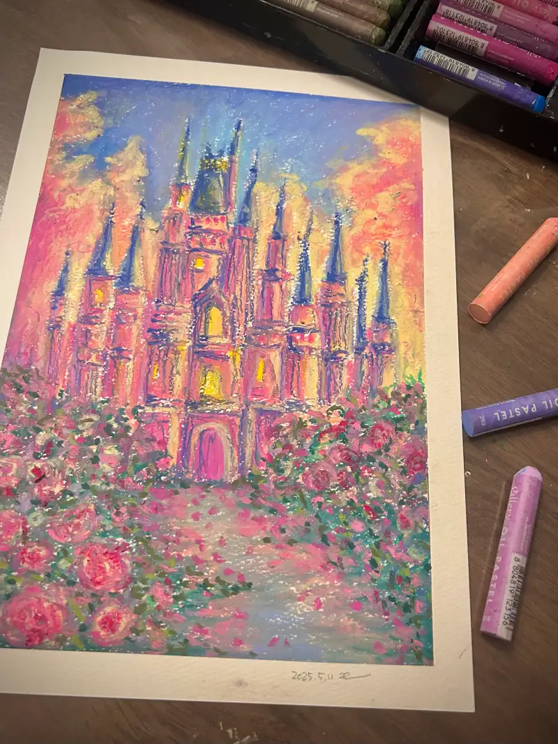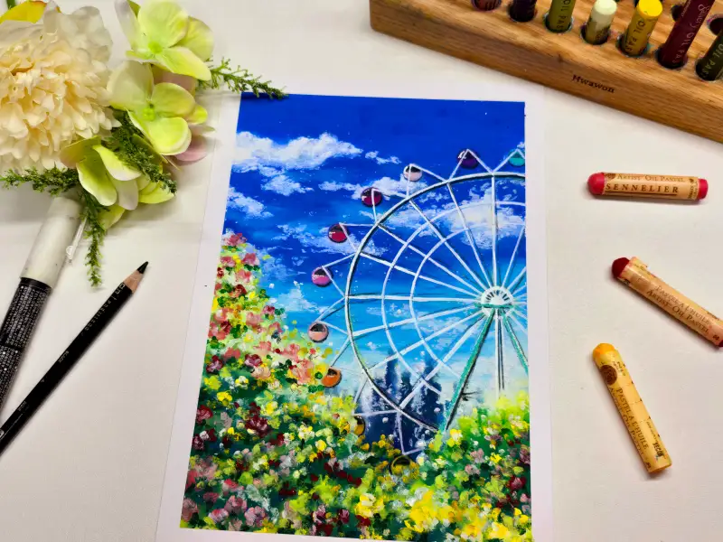 화창한 날씨, 풀 사이로 아름다운 놀이동산의 풍경이 보이네요! 오일파스텔의 폭닥한 느낌 너무 좋아요💙