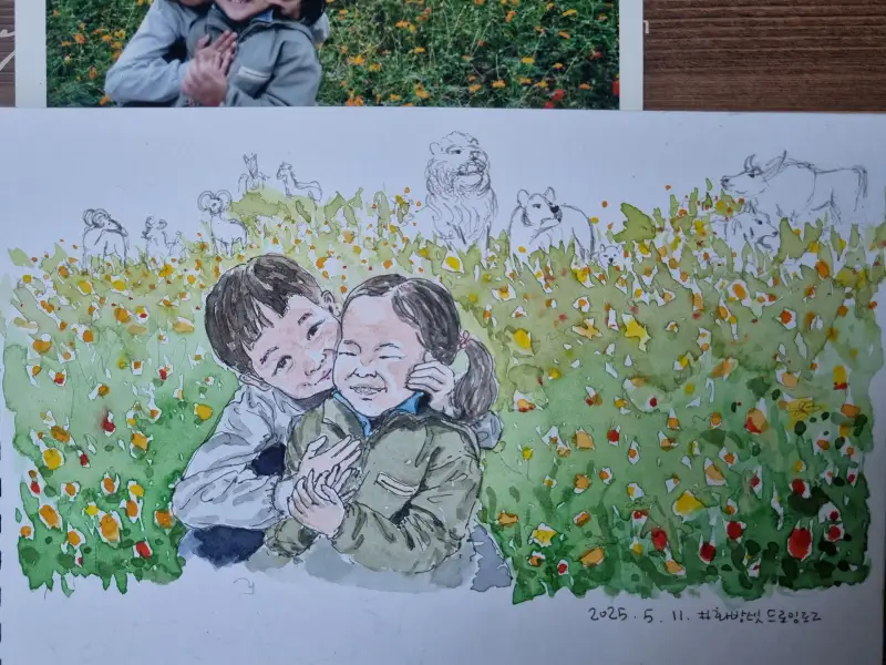 가족사진을 추억과 함께 사랑스럽게 그려주셨네요~! 뒤에 있는 동물 친구들까지! 멋진 그림이에요🥰