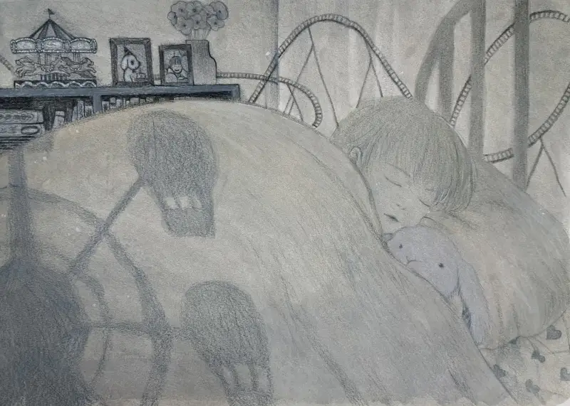 놀이동산에 가기 전날, 설레다가 잠든 아이의 모습 같아요~ 뒤에 회전목마와 액자 등 디테일이 돋보여요!🥰