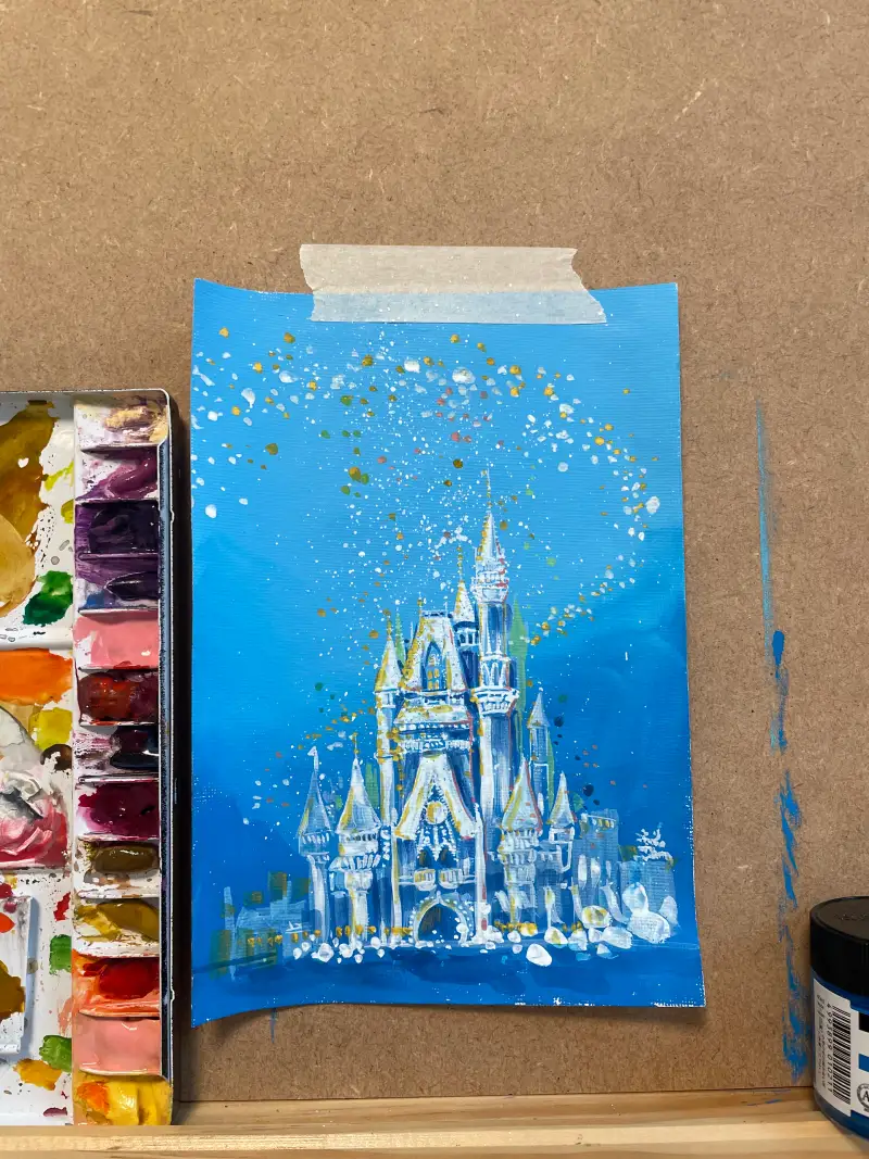 중간작업은 너무 집중하다 보니까 없어졌네요. 원래는 배경을 깔아놓고 화이트 물감으로만 세필묘사를 해보자 작업했는데, 너무 차가운 색깔만 있어 엘사 성이 되어버릴까 싶어, 따뜻한 색감을 좀더 넣어봤습니다. 오랜만에 잡는 세필붓이라 손이 너무 부들부들..