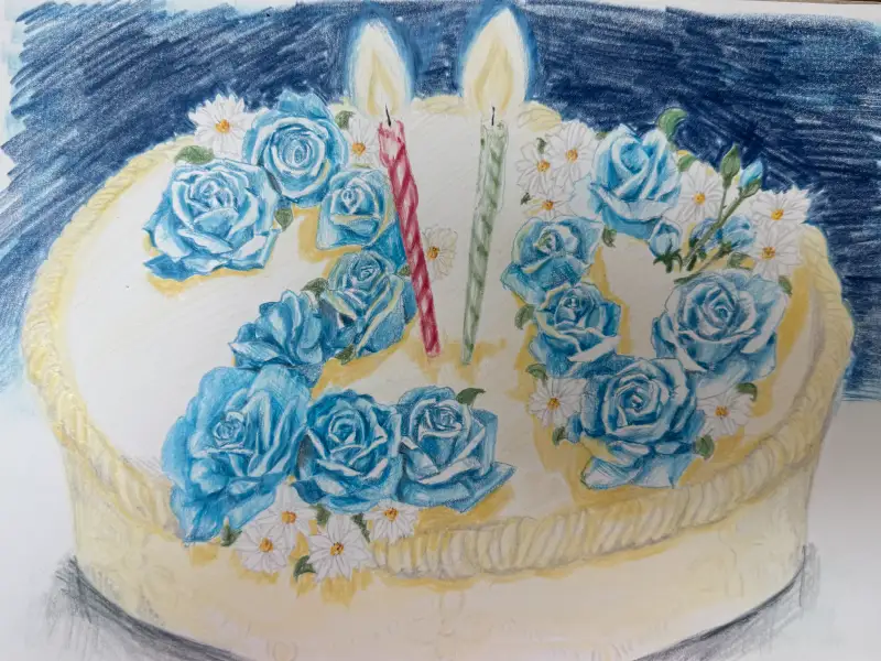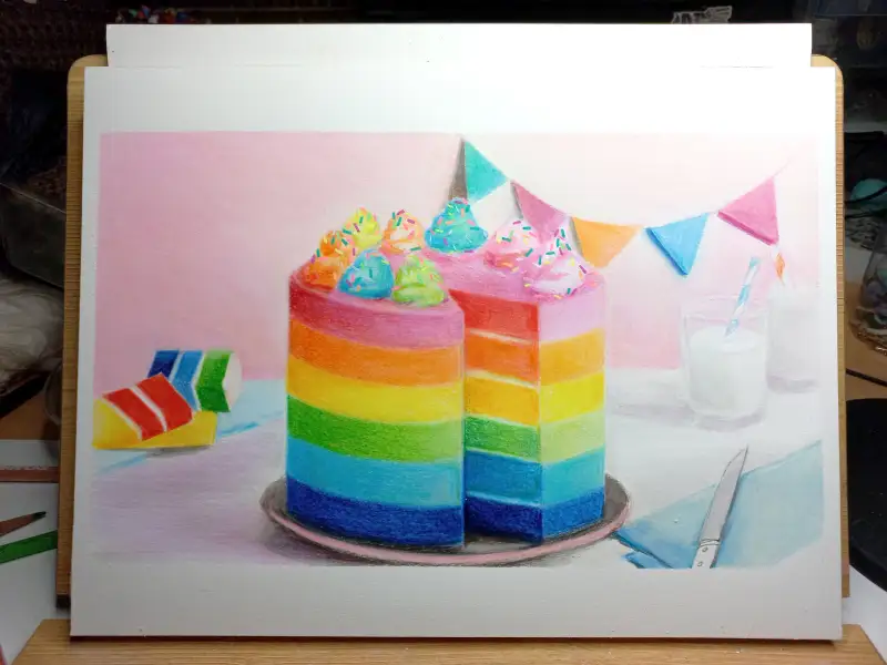 부드러운 색연필로 정성 가득한 그림을 그려주셨어요! 보기만 해도 기분이 좋아지는 컬러풀한 케이크예요!🌈