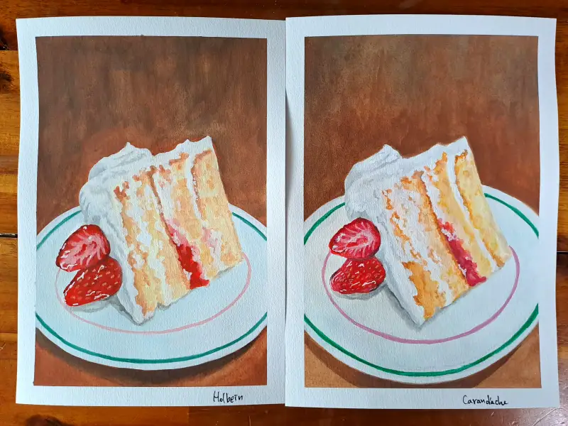 분명 같은 그림인줄 알았는데~? 두 가지 브랜드의 과슈로 조각 케이크를 멋지게 그려주셨네요!🍰