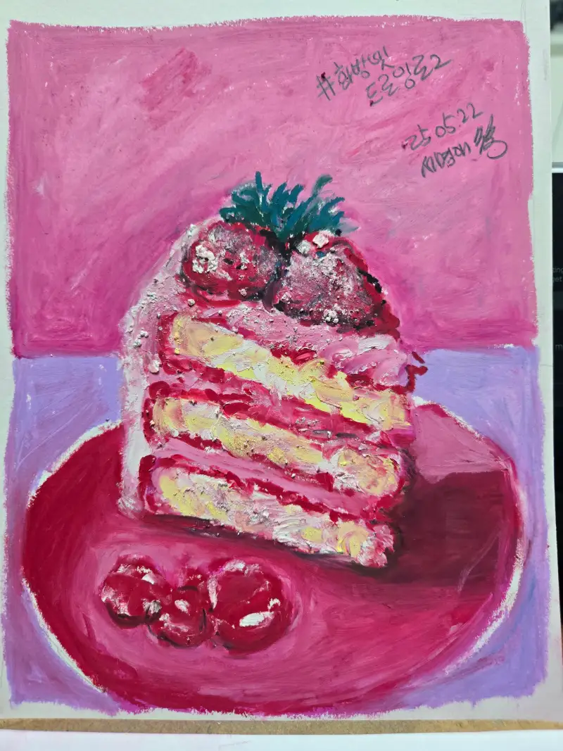 꾸덕~한 느낌이 제대로 느껴지는 레드벨벳 케이크네요! 오일파스텔 색감이 쨍하니 이뻐요!💗