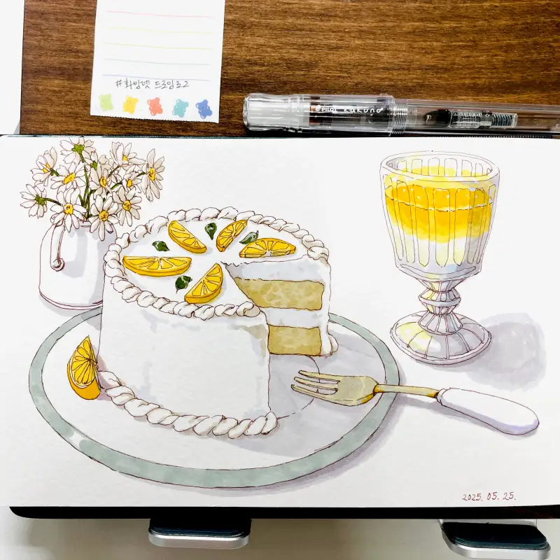 작가님만의 그림체로 케이크를 담아주셨어요! 향긋~한 향기가 날 것만 같은 예쁜 그림이에요💛