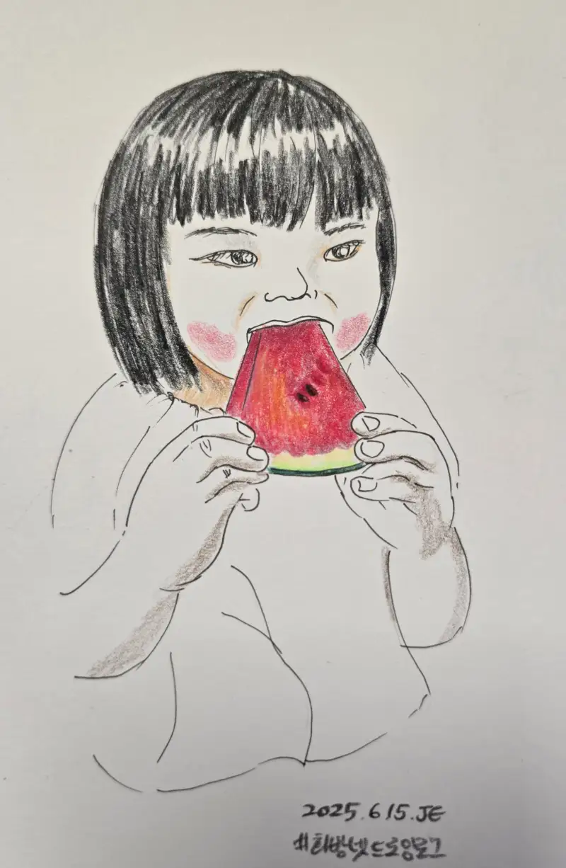막상 과일 찍은 사진이 많이 없네요. 몇 년 전, 막둥이 목에 손수건 걸고 수박 먹는 사진이 있어서 그려봤습니다. 손 그릭 힘들지만. 얼굴이 귀엽게 나와서 나름 성공..이라고 올려요^^