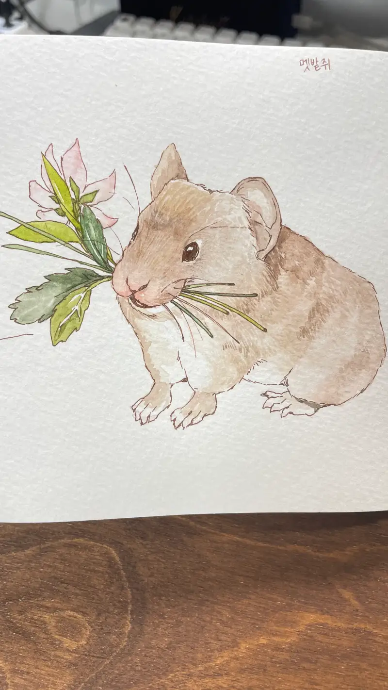 꽃을 든 멧밭쥐입니다. 길상 먹 물감을 이용해서 그려봤더니 차분한 색감으로 표현되네요..!