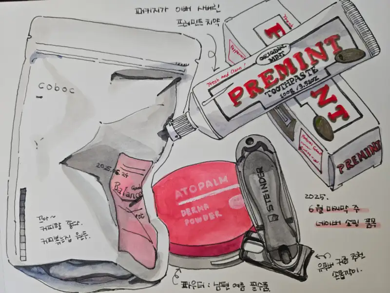 고민고민하다가, 주간 그림일기로다가 이번 주 네이버 쇼핑 품목들을 그려봤어요.