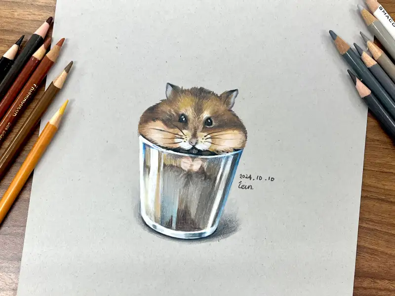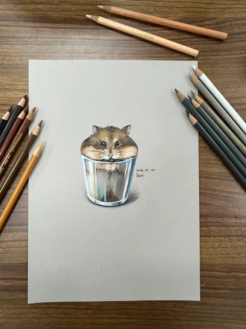 그러다 컵안에 뭔가 귀여운 생명체를 함께 그려보고 싶어 유리컵 안에 햄스터가 들어간 모습을 상상해서 그려봤어요.