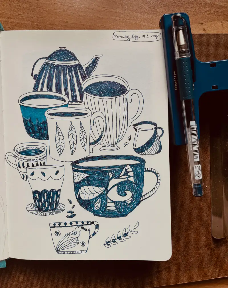 손에 잡히는 유니볼펜으로 아이디어 스케치북에 두들하듯이 컵 그려봤어요:)
