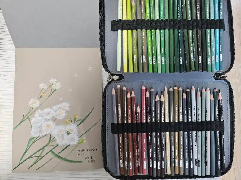 얼마전 구매한 프리즈마 색연필 낱색(이제 150색 꿈을 이뤘..)과 150색을 다 담고도 남는 넉넉한 몽마르이트 색연필 가방을 산 기념으로 그렸습니다