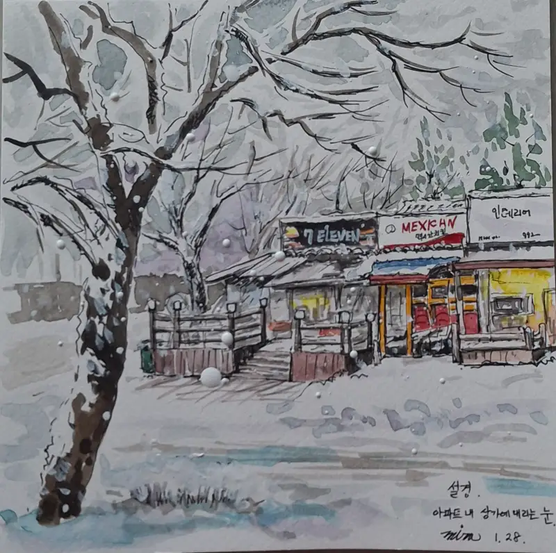 눈이 펑 펑~ 내리던 날 저는 사진 찍기에 바빴어요. 예쁜 풍경을 잠깐 보기만 하기에는 너무 아까워서요. 드디어 오늘. 그때를 생각하며 사진을 보고 그림을 완성했어요.