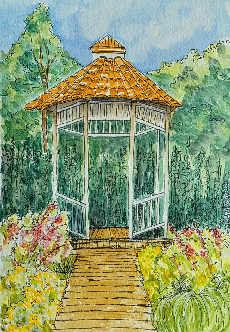 봄이 머무는 주황색 지붕의 정자.
