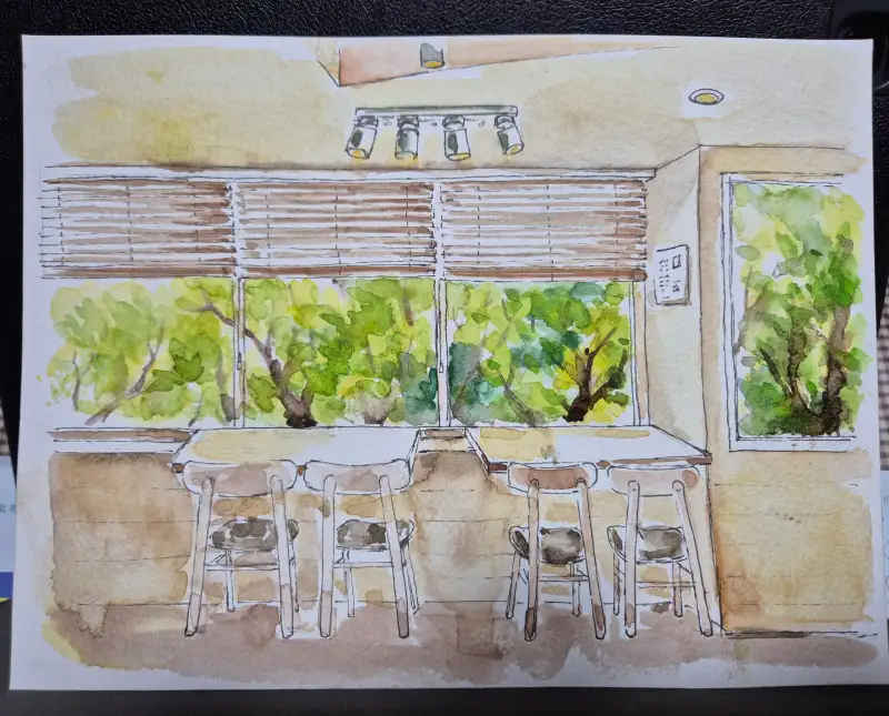 창가에서 보는 나무들이 예쁜 카페인데 나무 표현이 쉽지 않네요. 사계절을 즐길 수 있는 카페라 좋아합니다.