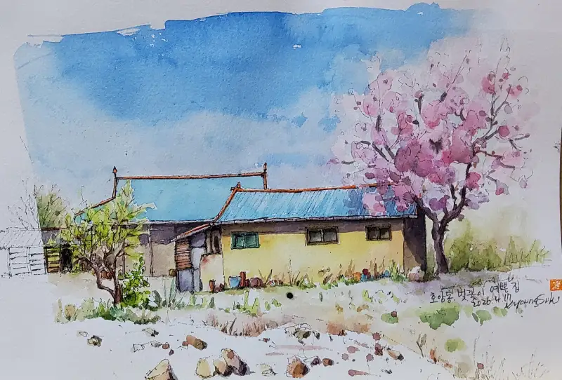 벚꽃 핀 풍경을 수채화 물감의 번짐을 이용하여 표현해 보았다.