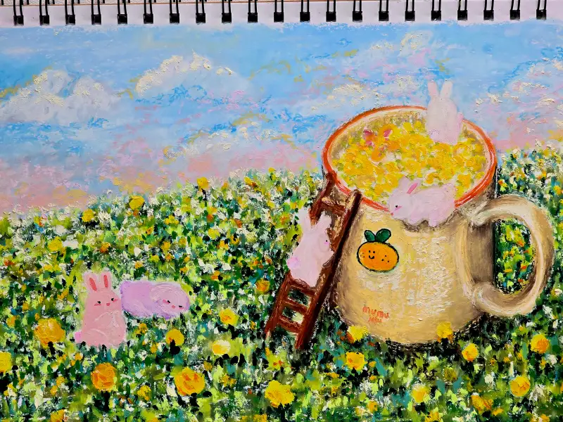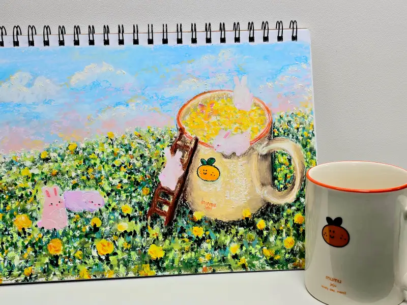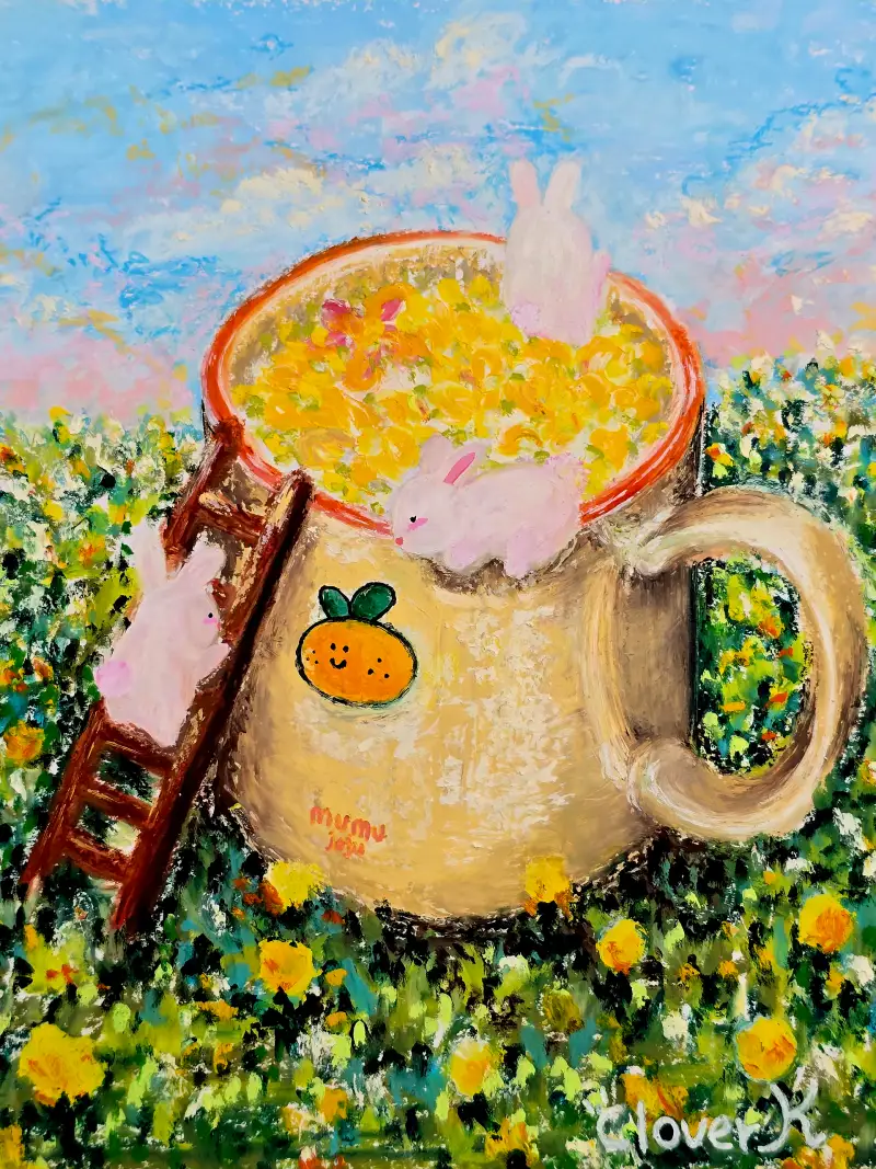 컵 속에 꽃들을 가득 담고 귀여운 토끼들이 꽃밭과 컵 속에서 노는 모습을 그렸습니다^^
