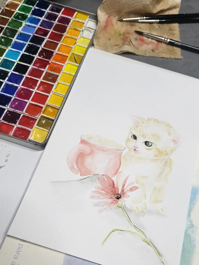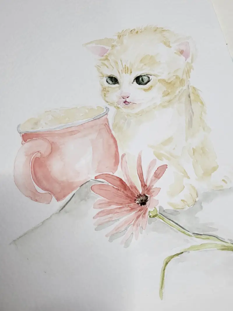 컵과 고양이와 꽃