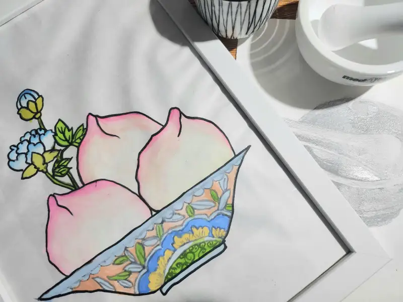 아이와 함께 그렸던 복숭아가 담긴 그릇을 닮은