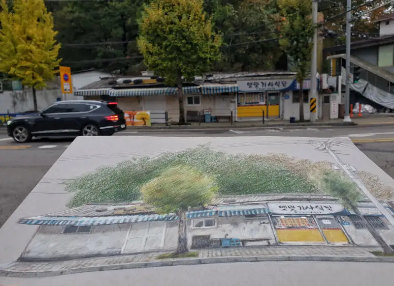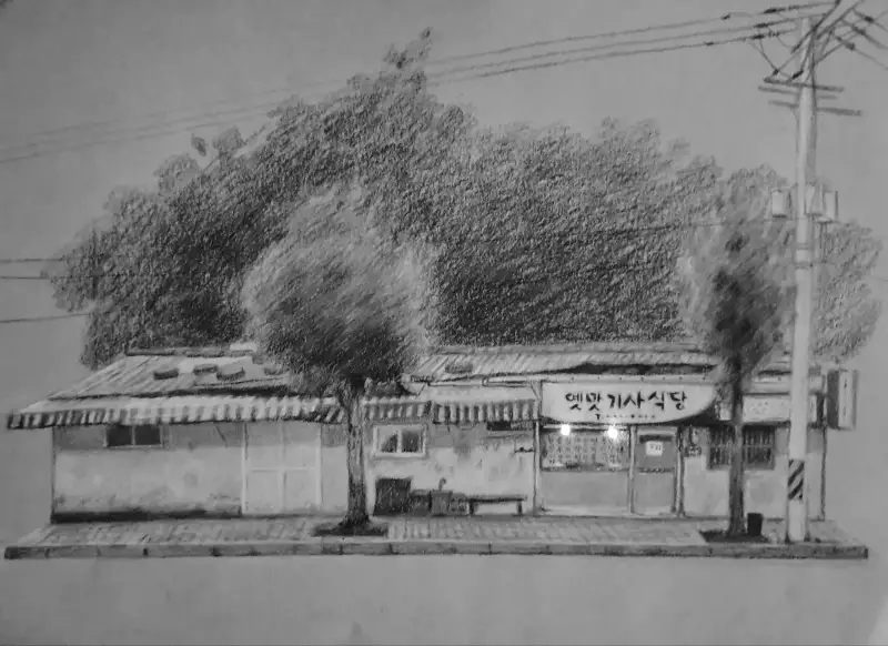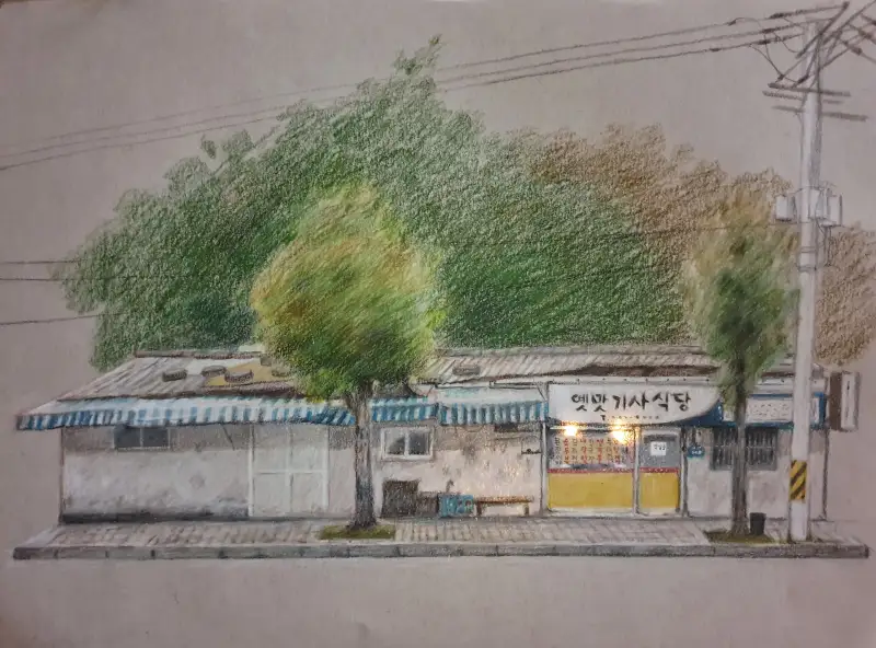 식당명답게 외관도 오래되었고, 내부는 더 낡은 기사식당. 하지만 청국장, 해장국등이 우리 가족의 입맛에 잘 맞아 자리가 불편해도 즐겨가던 식당입니다. 엊그제도 어두워질 무렵 식당을 지나쳐오면서 딸이 오랜만에 가고싶다고 했으나 시간에 쫒겨 사진만 찍고 돌아와 그림으로 남겨봅니다.
