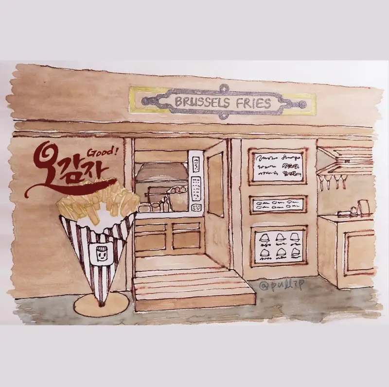 화선지에 커피베이스와 젤펜으로 그린 감자스낵가게예요.