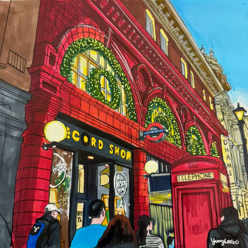 미국 플로리다 올란도 디즈니랜드에 갈일이 있었는데 크리스마스 시즌이라 사람이 많고 정신 없는 와중에 따뜻하고 포근한 분위기의 레코드 샵 건물이 생각났어요 그때의 느낌을 회상하며 그렸습니다.👀