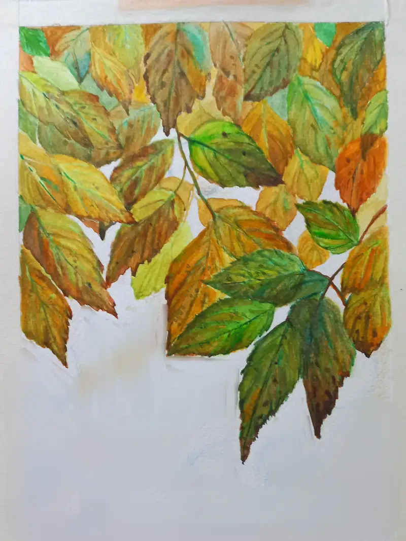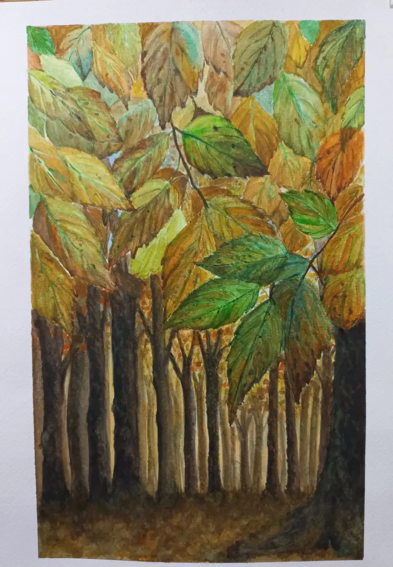 물들어가는 잎사귀 에서 가을로 깊게 물들어가는 숲을 그려봤습니다.