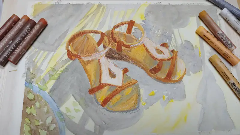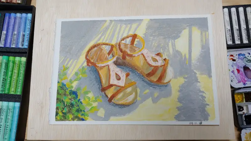 수성색연필+수채물감으로 바탕색 채색을 하고 위에 오일파스텔을 발라보았습니다.