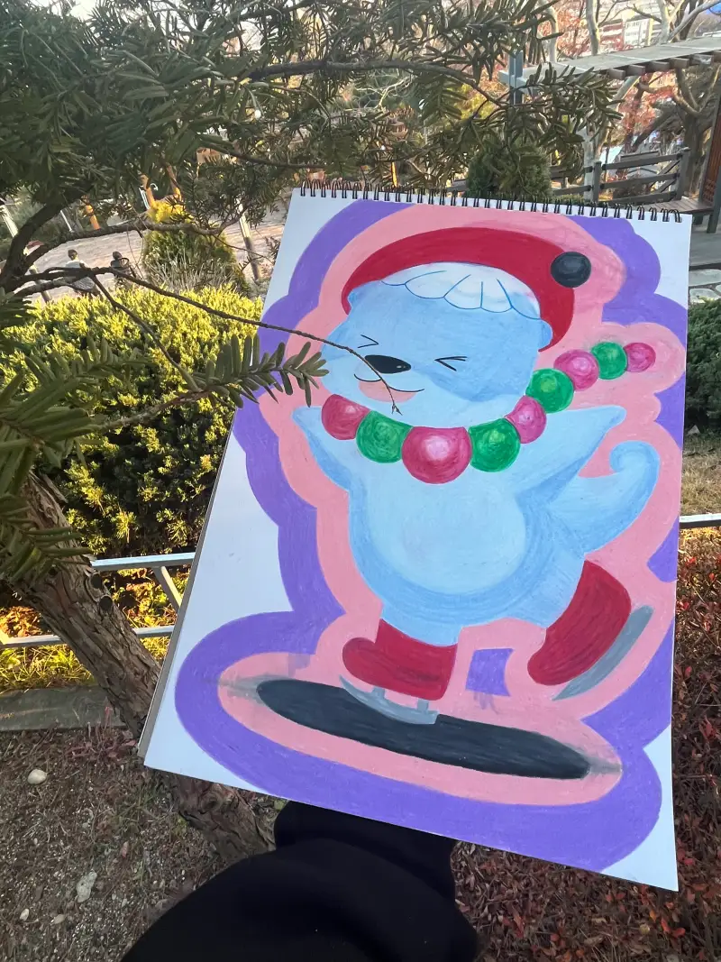 진주 남강에 사는 수달을 상징으로 하는 하모는 머리에는 조개 모자를 쓰고 있고 목에는 진주 목걸이를 하고 있습니다. 진주 목걸이는 크리스마스 컨셉으로 꾸며보았고 머리에는 산타모자를 씌워주었습니다. 그리고 진주에는 겨울마다 스케이트 장을 운영하는데요! 신나게 스케이트를 타는 하모를 그려보았습니다. 진주로 많이 놀러오세요~❣️