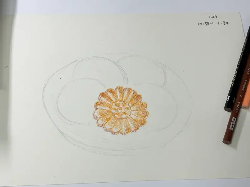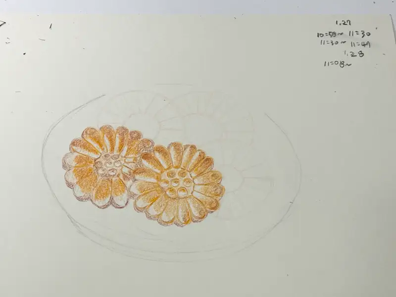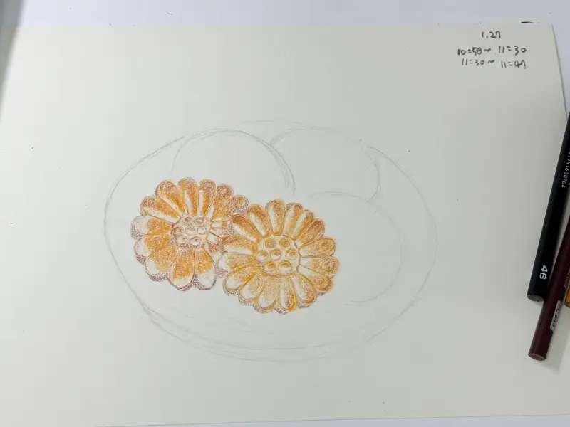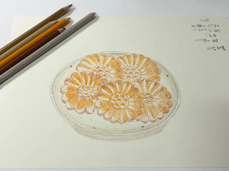 연필로 연하게 밑그림을 그리고, 약과 한개만 우선 그려봅니다.
