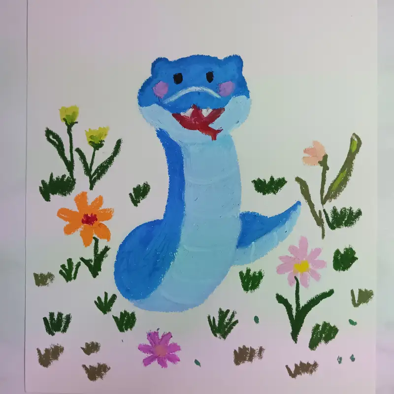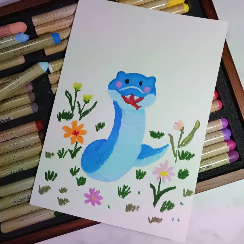 화원오일파스텔로 푸른 뱀을 귀엽게 그려보았습니다. 청뱀과 함꼐 꽃과 풀들도 조금 넣어 보았네요.