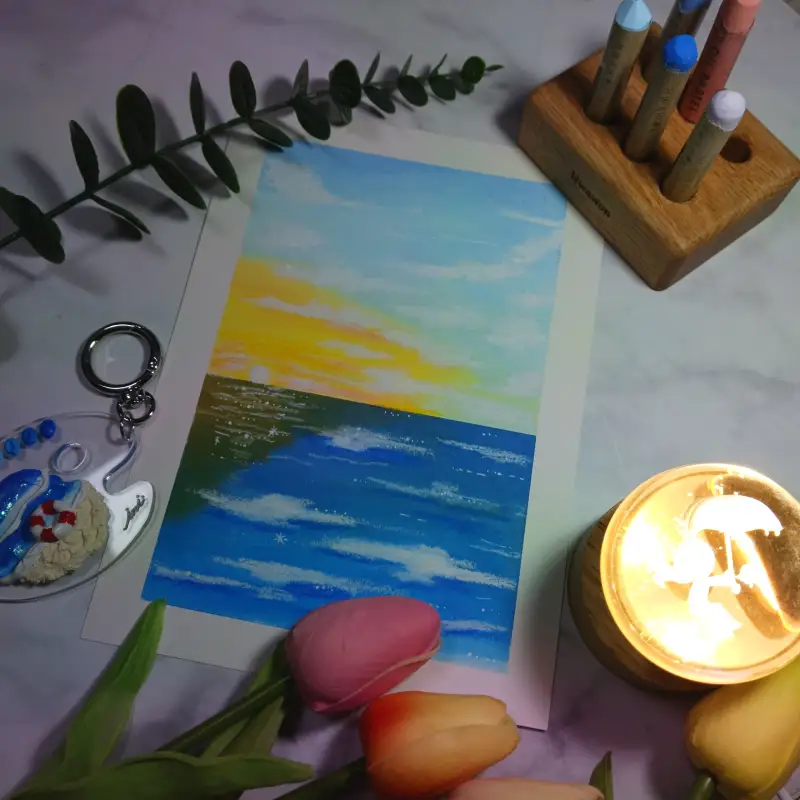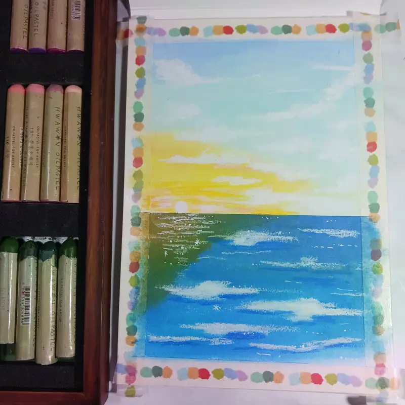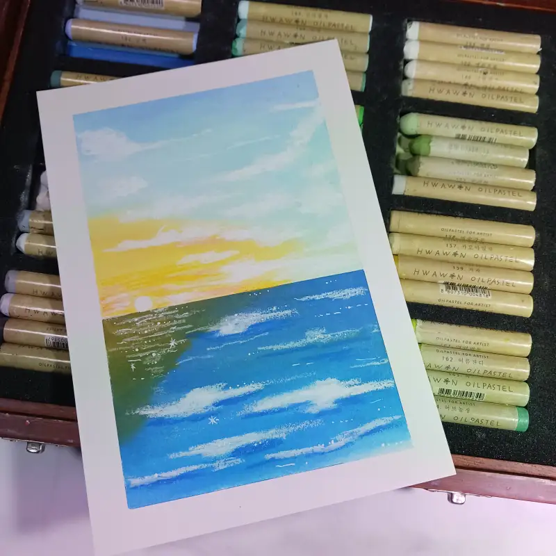 역시 이번에도 화원오일파스텔로 그렸어요. 풍경을 많이 못그려봤지만 새로운 기법이 아직은 버거워서 늘 그리는 방식으로 그려 보았어요. 동해라고 해도 믿고 서해바다라고 해도 믿을 만한 그림을 그려보고 싶네요.
