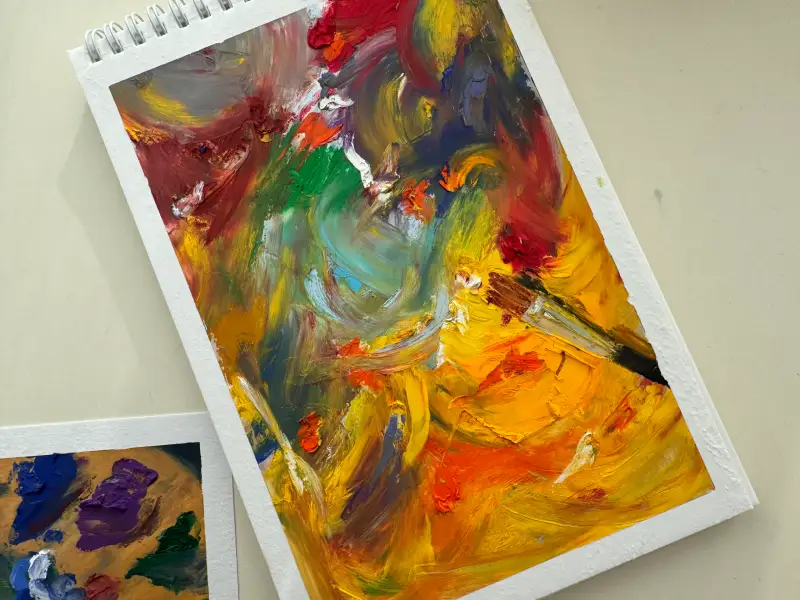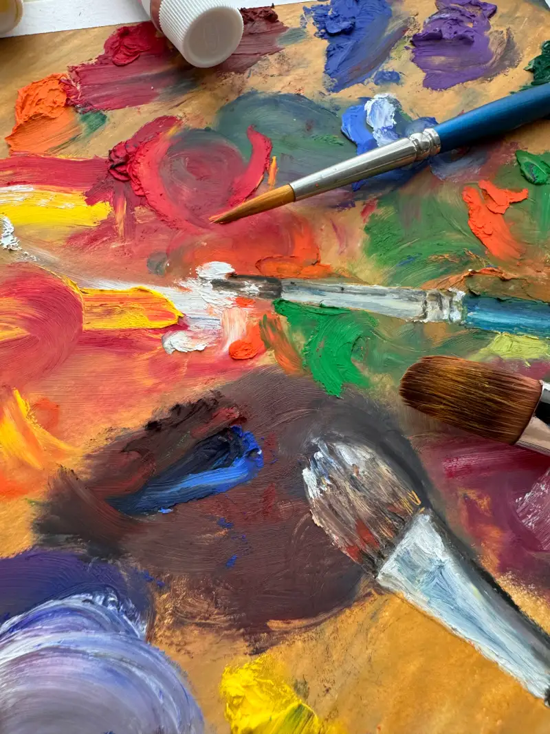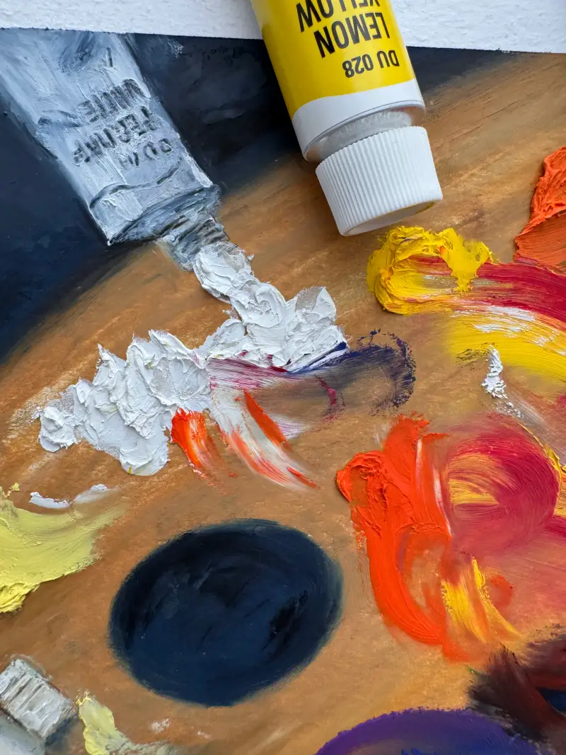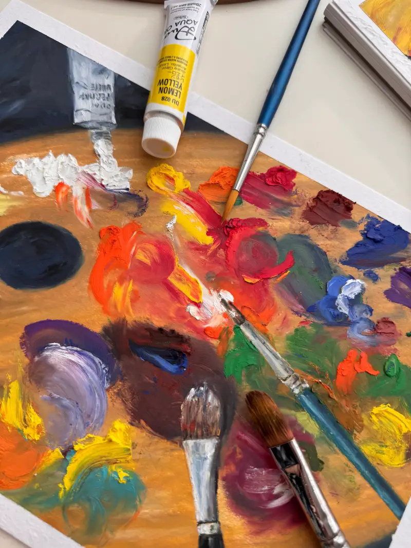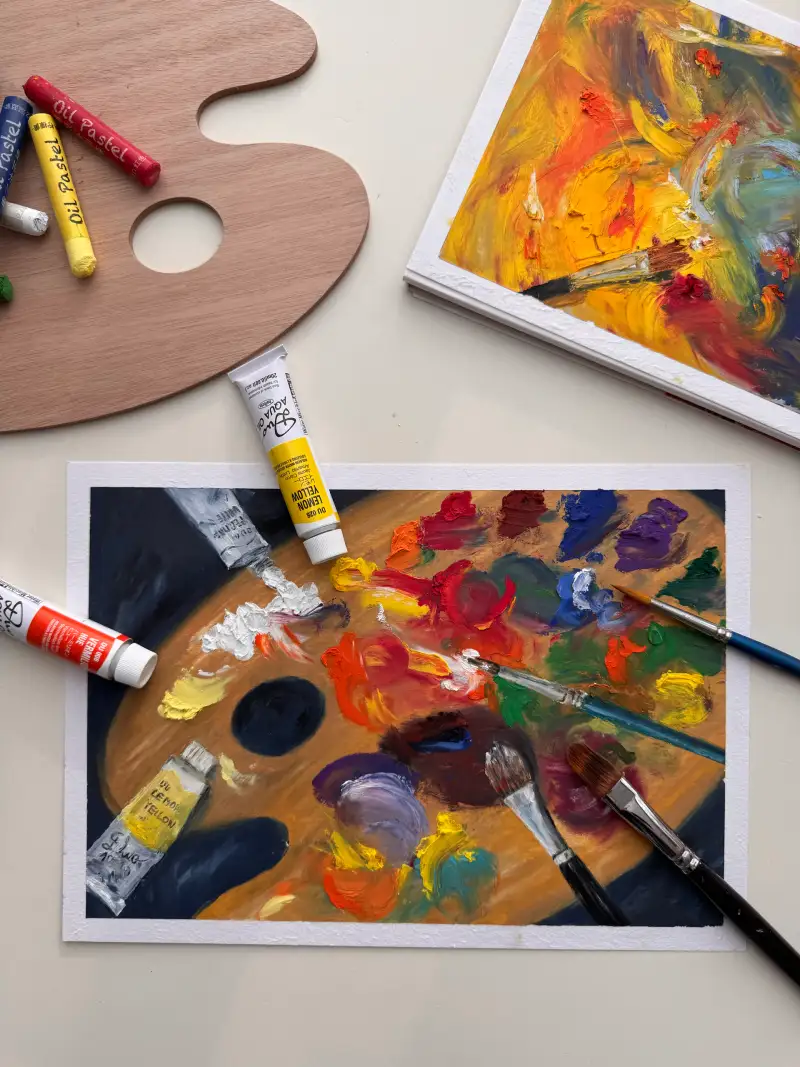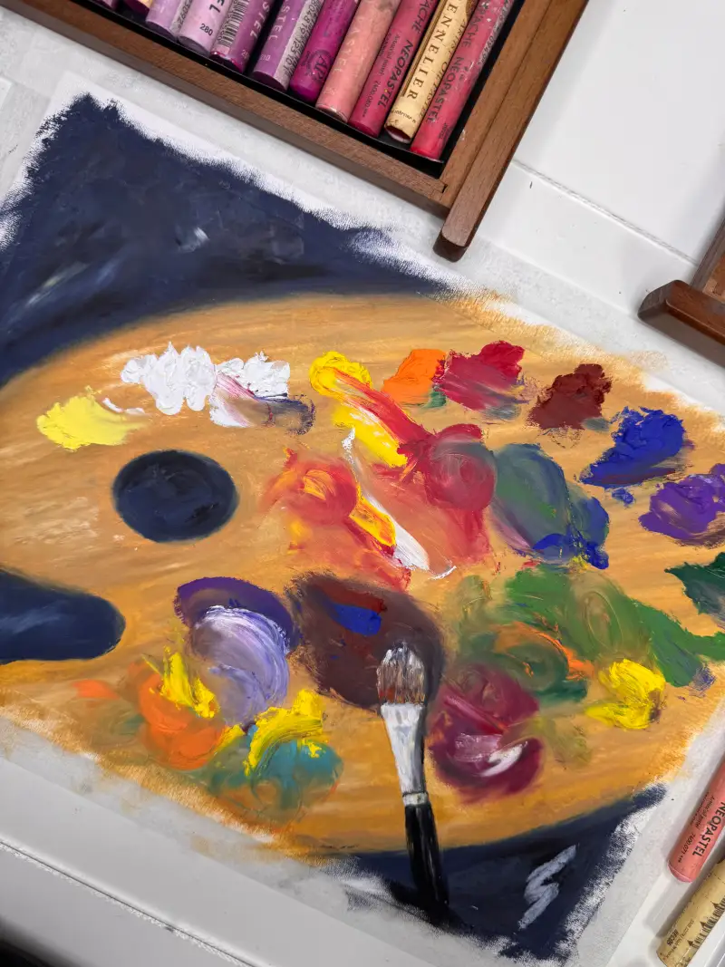 유화 작업의 묘미는 물감이 섞여있는 팔레트라고 생각해서 저는 오일파스텔로 유화 팔레트를 표현해봤어요☺️