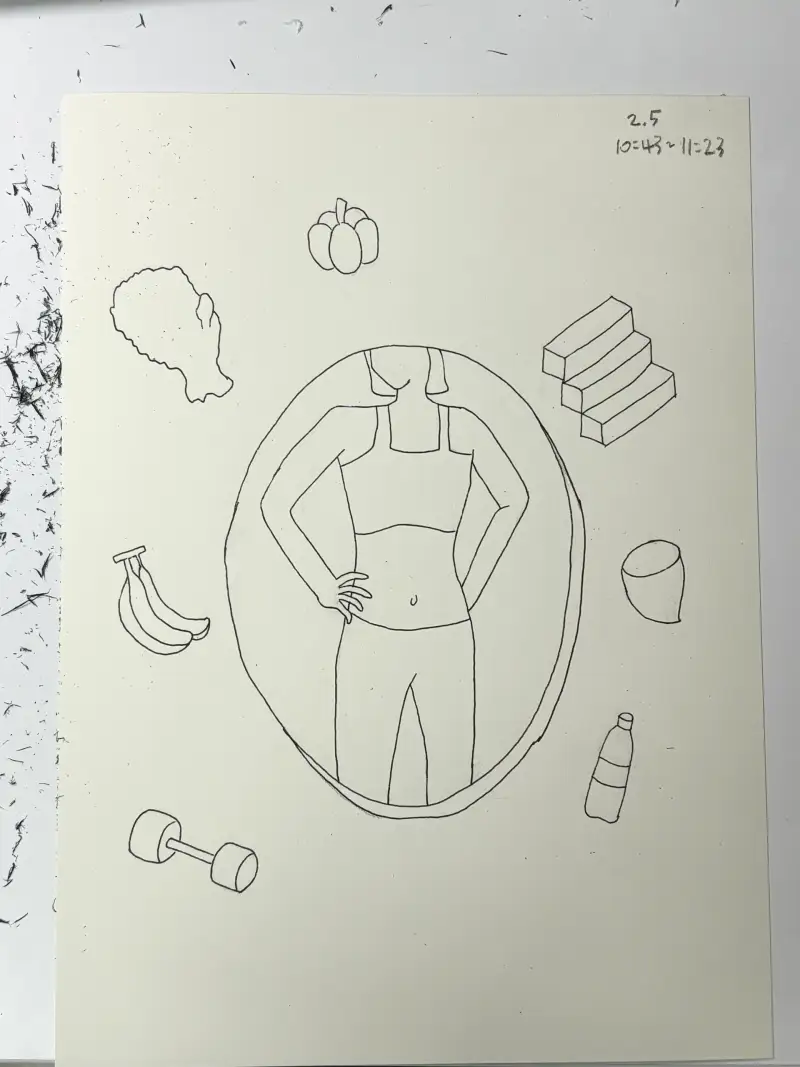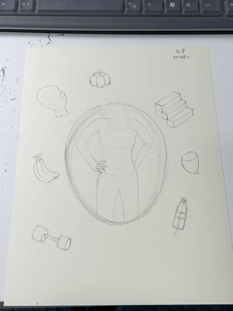 계단? 샐러드? 몸만 그릴까? 고민하다 모두 한장에 집어넣어 보았습니다ㅎㅎ