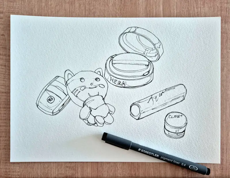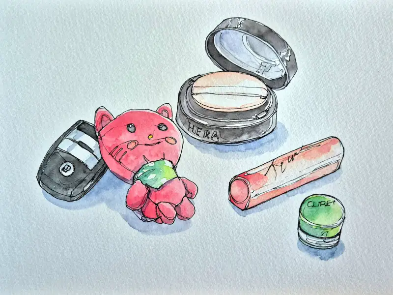 제 가방속의 물건은 차키.헤라쿠션,입술이 너무 잘 터서 꼭 필요한 알로에크림, 립글로즈.. 다른것도 있지만 대표적인것만 그려봤어요. 이번에 구매한 문교 수채화 고체물감과 쿠레타케 워터브러쉬로 가볍게 채색해 봤습니다.
